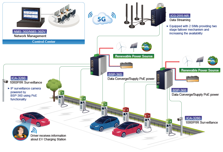 By utilizing a Renewable Power Managed Ethernet Switch (BSP-360), the network connectivity of the charging station can achieve power independence which is able to collect renewable power on its own and send data via the 5G NR Cellular Gateway (ICG-2515-NR) to the station operator.
