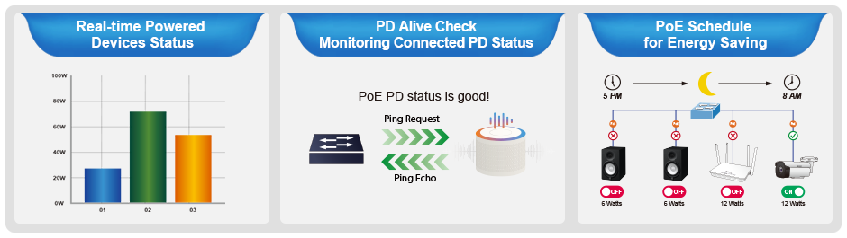The switch boasts a total 450-watt PoE budget and features fanless, silent operation with under 200W consumption and 10GB link ports. This establishes it as a robust powerhouse capable of efficiently supplying power to various devices like cameras, speakers and displays in a Pro AV environment, APs, routers, etc.