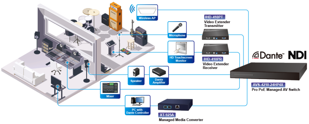 Dante is considered the most widely used audio protocol in the industry. The switch’s setting comes pre-configured with the Dante and the NDI video protocol.