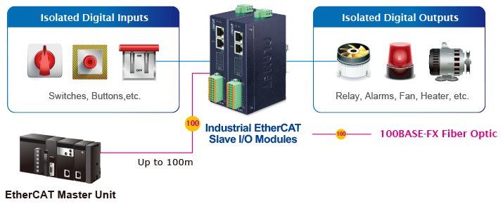 PLANET IECS-1116-DI and IECS-1116-DO are industrial EtherCAT slave I/O modules equipped with the EtherCAT protocol for today’s distributed industrial applications. The IECS Series provides high-density digital input/output channels and is protected with 3750V DC isolation. Its compact size and DIN-rail mounting make installation in a cabinet easy. Pluggable terminal blocks and LED indicator help users to maintain and set up their system.