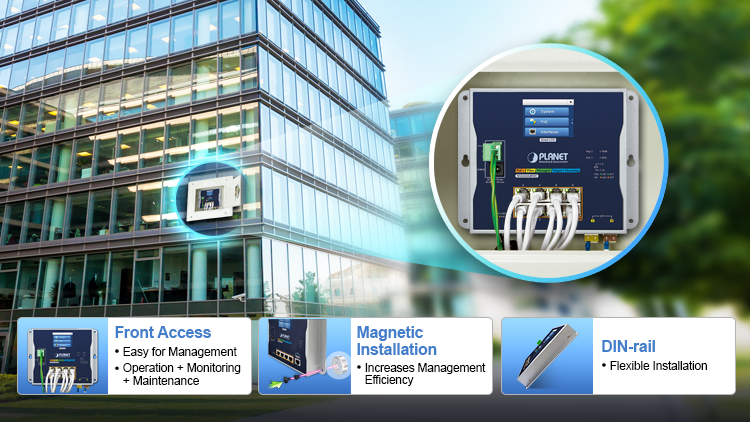 To facilitate network deployment in limited spaces such as in-wall enclosures whether in the building or outdoors, PLANET has the industrial Ethernet switches and wireless AP designed in a compact, flat-type casing. The flat-type products are designed with the flexible and innovative installation including fixed wall mounting, magnetic installation or DIN rail, thereby maximizing product usability. All front access design and the user-friendly color touch LCD provide IT managers with efficient network management and easy maintenance.