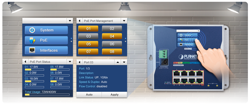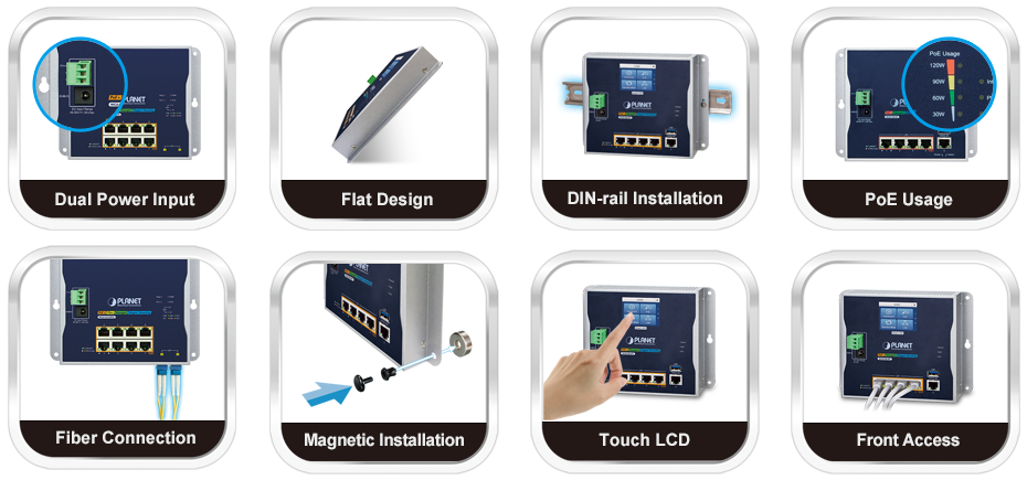 PLANET Industrial Flat-type Ethernet Solution covers products such as Flat-type Touch LCD Managed Switches, Flat-type Managed Switches and Flat-type Smart Routers.