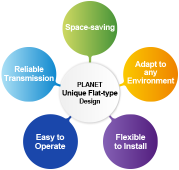To facilitate the network deployment in any space-limited locations like wall enclosure or electric box found in buildings or outdoors, PLANET has developed its unique industrial Flat-type Ethernet design to cater to the demand for space-saving network transmission.