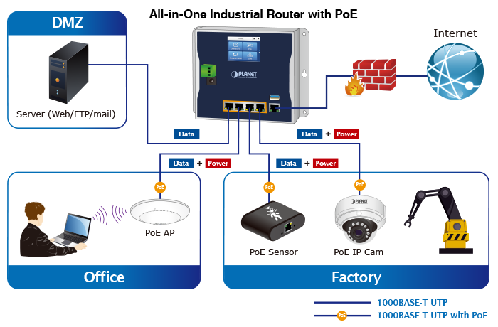 PLANET Flat-type Ethernet Switches and Routers nicely fit in with any network infrastructures given their compact size. They are best for all buildings and factories where harsh temperatures ranging from -20 to 70 degrees Celsius can be experienced. They can be installed by wallDIN-rail or magnetic mounting. The Front Access design makes the installation, cable wiring, LED monitoring and maintenance very easy. The reinforced cybersecurity protection, rapid recovery function and high-speed data transmission reliably enhance the communication performance. PLANET Industrial Flat-type Ethernet Solution makes it easy to turn facilities into a network automation environment.