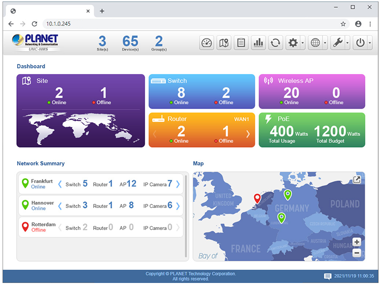 PLANET Network Management Solution helps service providers and IT managers control all PLANET network devices through a single platform. It also enables SMB IT administrators to effectively manage a local network of up to 512/1024 managed nodes and 100 sites simultaneously.
