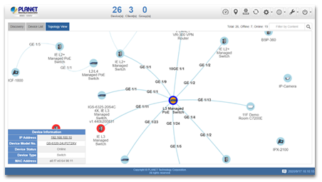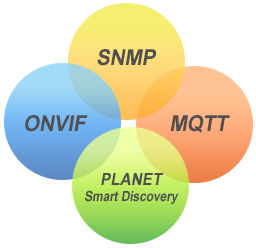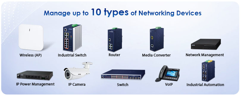 PLANET Network Management System (NMS) Solution successfully integrates MQTT, SNMP, ONVIF protocol and PLANET Smart Discovery to enable IT administrators to monitor and further manage up to 10 types of networking devices, covering switches, routers, VoIP, IP Surveillance devices and more.