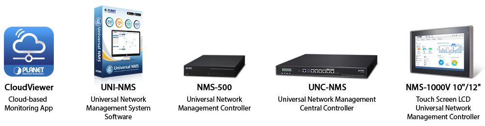 PLANET Intelligent Network Management System Solution includes the software-based UNI-NMS, hardware-based controller, NMS-500, Touch LCD controller, NMS-1000V, UNC-NMS, and the latest mobile app “CloudViewer” to attend to different applications. PLANET NMS solution features intuitive dashboard, topology and map viewing to make network management efficient and effective.