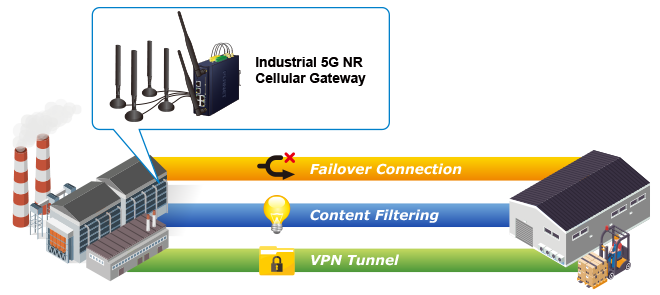 The ICG-2515W-NR Industrial 5G NR Cellular Wireless Gateway is equipped to provide complete security and privacy for exchanging sensitive data. It has built-in IPSec VPN function with DES/3DES/AES encryption and MD5/SHA-1/SHA-256/SHA-384/SHA-512 authentication, and GRE, SSL, PPTP and L2TP server mechanism. The full VPN capability in the ICG-2515W-NR makes the connection secure, more flexible, and more capable.